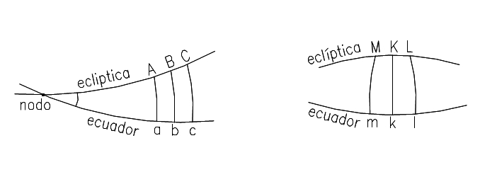 | Figura 3. Los puntos a, b, c, sobre el ecuador, son las proyecciones de los A, B, C, sobre la eclíptica. Los segmentos AB, BC son más largos que sus proyecciones ab, bc. Al contrario los segmentos MK, KL en el solsticio son más cortos que sus proyecciones sobre el ecuador mk, kl. |
