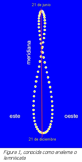 Si apuntásemos la cámara hacia el sur y tomásemos todos los días de un año una fotografía del sol al medio día, la imagen resultante sería similar a la que se muestra en la figura 1. La línea roja corresponde a la meridiana del lugar y los puntos amarillos serían las diferentes imágenes del Sol. Vemos que en cada imagen el Sol ocupa una posición diferente. Esta forma similar a un ocho se conoce como analema o lemniscata.