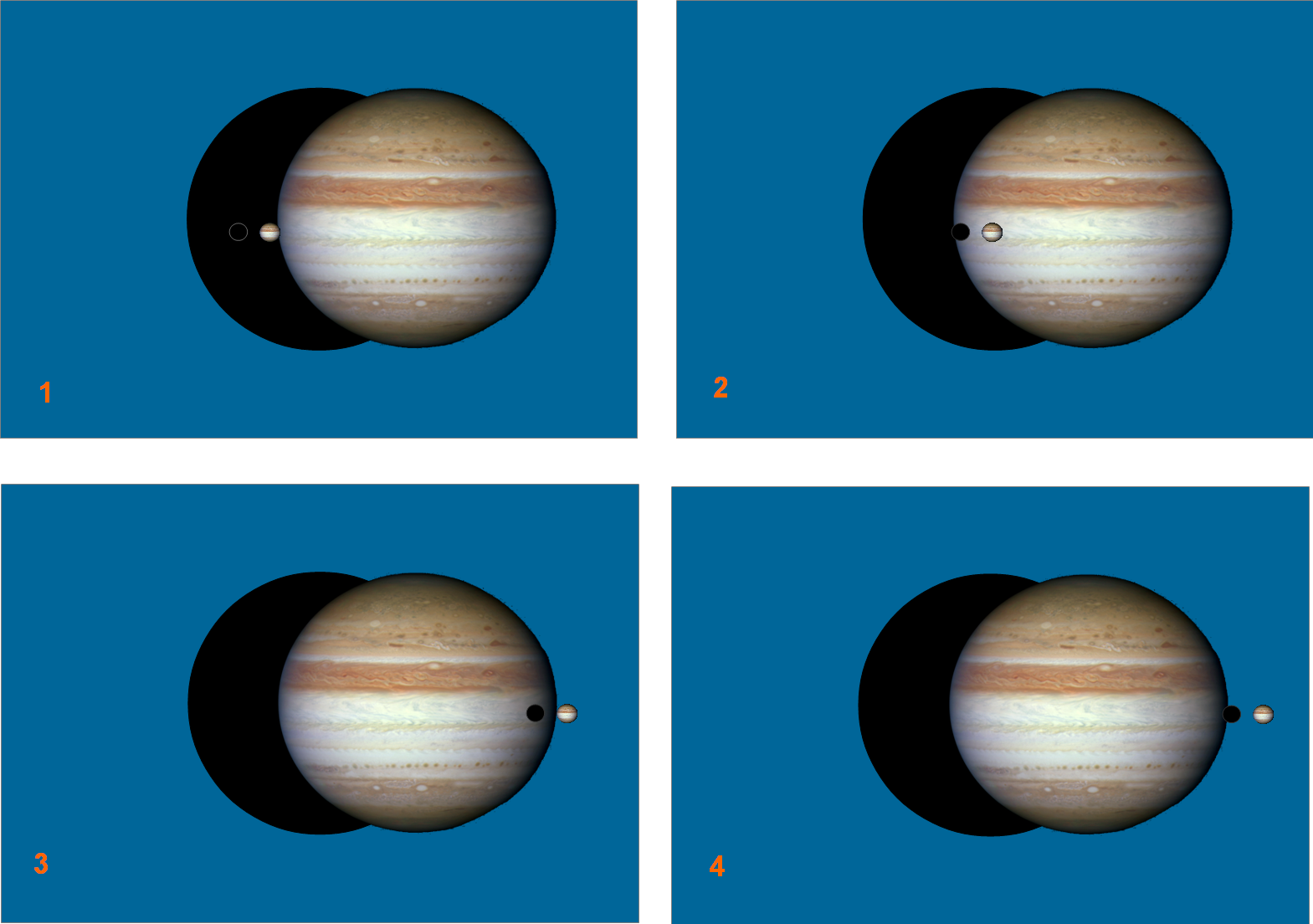 3.2: Comienza el tránsito de la sombra del satélite. Se observa como un punto negro en la superficie del planeta, es fácil de observar con telescopio y una noche sin turbulencia.