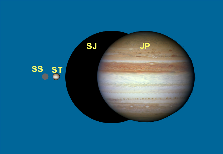 La figura 1. Muestra la posición del Sol, Tierra, Júpiter y un satélite representados desde el polo norte de la eclíptica. Tanto Júpiter como los satélites y la Tierra giran en sentido contrario a las agujas del reloj. Los conos negros representan las sombras de Júpiter y del satélite. Vemos que desde la oposición hasta la conjunción la sombra del planeta está al este, -el planeta es visible por la tarde- y desde la oposición a la conjunción la sombra está al oeste -el planeta es visible por la madrugada-.