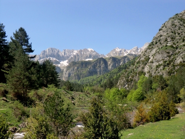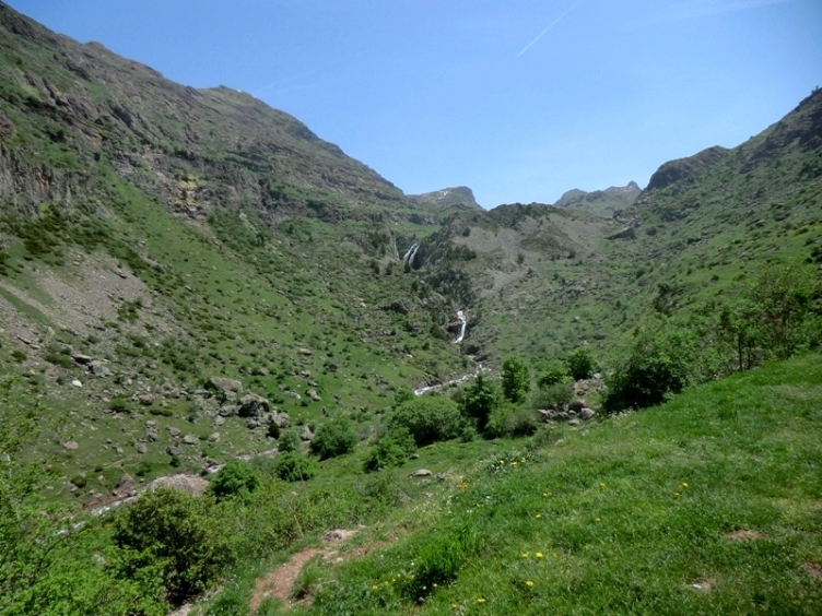 Al girar una curva nos adentramos en el barranco de Acherito, desde nuestra altura vemos que la senda desciende hasta un refugio y podemos seguir con la vista el itinerario al otro lado del valle. En el refugio hemos cambiado de dirección que ahora será sureste hasta el final por la margen derecha del barranco de la Ferrería. Cruzamos dos arroyos, el de mayor caudal es el que desciende del Mayo de las Ferrerías, una pared caliza que bordea el valle por el suroeste. Los arroyos en esta época van bastante crecidos, algunas piedras nos facilita el cruce, el sendero continua en constante descenso, con menos pendiente que el ascenso. Durante el último kilómetro apenas hemos perdido altura, desde nuestra atalaya divisamos todo el valle hasta las últimas cumbres, los picos de Arre y Gabedallos, fronterizos con Francia. Sólo nos queda el último descenso que con un buen desnivel nos conduce al aparcamiento que desde hace rato tenemos a la vista.