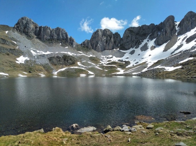 Ibón de Acherito, la fotografía está tomada en dirección noreste, a nuestra derecha las laderas orientadas al noroeste aun conservan algo de nieve. Al frente la brecha de Hanas.