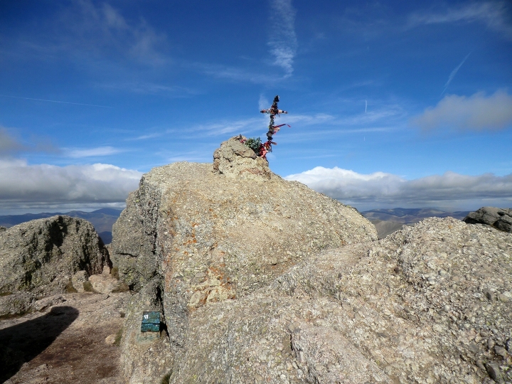 Vamos subiendo un poco a nuestro aire, sorteando rocas. Los últimos metros rodeamos el pico por el norte para girar hacia el sur y culminar. Una estrecha grieta, que nos llega por encima de la cintura, conduce a un hueco entre rocas, a la izquierda y tres metros por encima tenemos la cumbre, estrecha, para una sola persona, coronada por un mojón de piedras. La vista es magnífica, posiblemente toda Soria es visible desde el Urbión, al oeste la Laguna del Urbión.