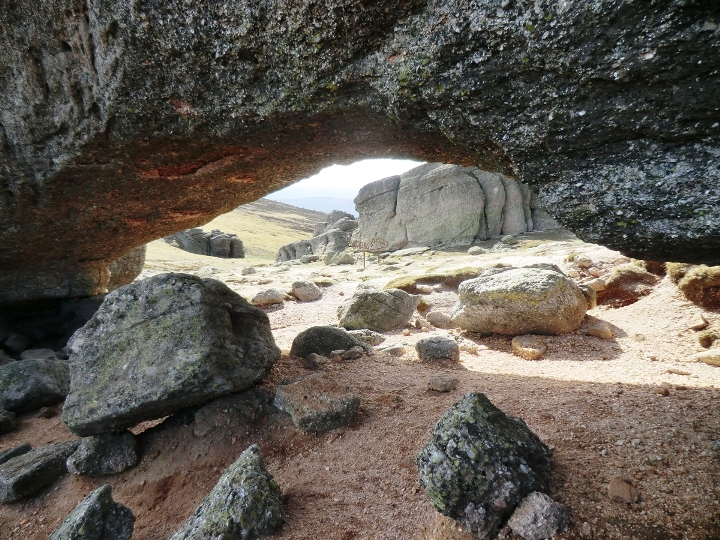 Accedemos a un amplio collado, a la izquierda desciende a las Fuentes del Duero, nacimiento del tercer río más largo de la Península, 897 km. Al norte el Urbión al alcance de la mano. El sendero se desdibuja entre rocas y arena de cuarzo. A la derecha un extraordinario arco natural abierto en la roca de 15 metros de luz.