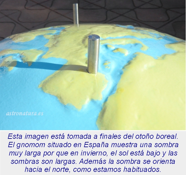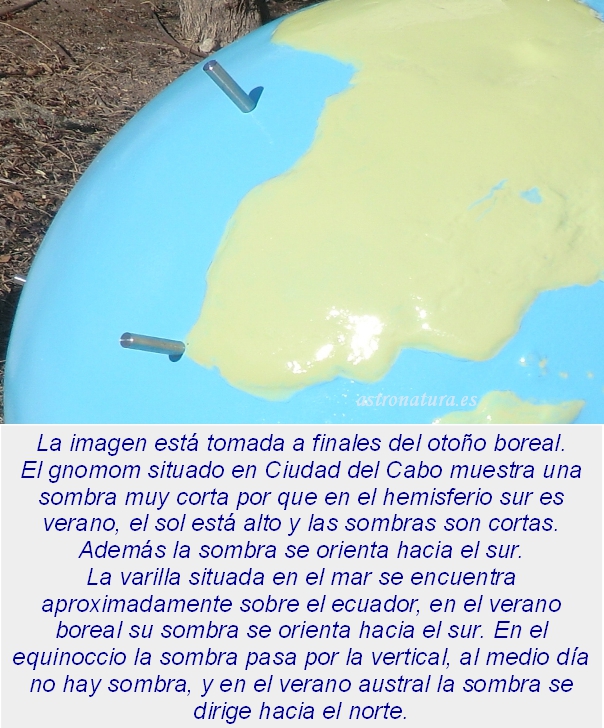 El día del equinoccio es el único con sol en los dos polos, en uno sale y en el otro se pone. También se han situado varillas en diferentes puntos del globo, sus sombras nos dan una idea de la hora en ese punto. Al amanecer en cualquier punto de la Tierra las sombras se dirigen hacia el oeste, en ambos hemisferios, pero conforme avanza el día en el hemisferio norte la sombra gira hacia el norte, las que están en el hemisferio sur la sombra se dirigen hacia el sur.