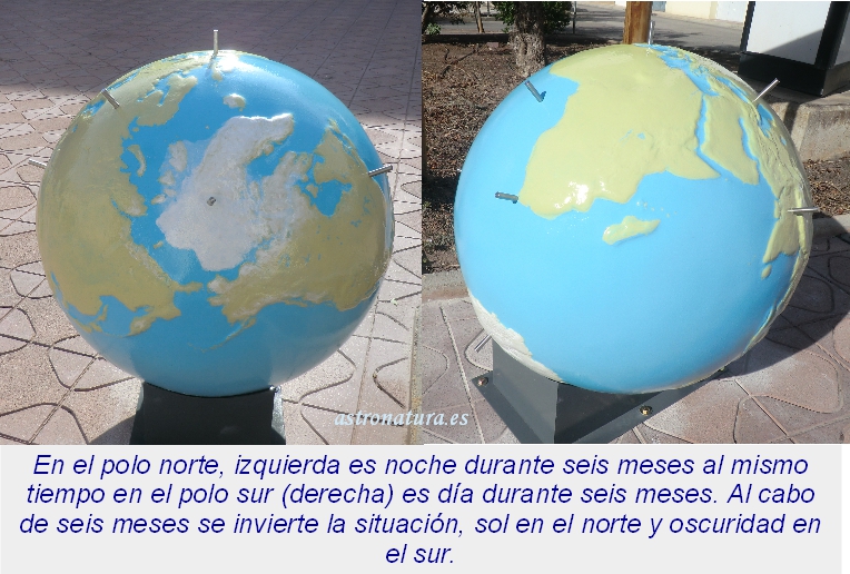 Con estas premisas donde el globo está iluminado por el sol, en la Tierra es día, y donde lo veas en sombra en la Tierra es noche. Observando el globo terrestre podemos saber en que zona de la Tierra es noche y que parte día. Si la observas hacia el medio día verás que en Norte América está amaneciendo cuando en la India se está poniendo el sol, o en China es noche. También es interesante ver como en el invierno boreal el sol no sale, ni al medio día en la zona norte de Noruega, lo que nos da una idea de lo corto que es el día en el norte de Europa o Rusia. Lo mismo sucede en la Tierra de Fuego en el invierno austral. El caso extremo tiene lugar en los polos, verás que uno de los dos polos del globo está en sombra durante todo el día, en ese polo es noche, el otro está con luz todo el día, en ese polo es día. De hecho cada polo se pasa seis meses de día y seis de noche.